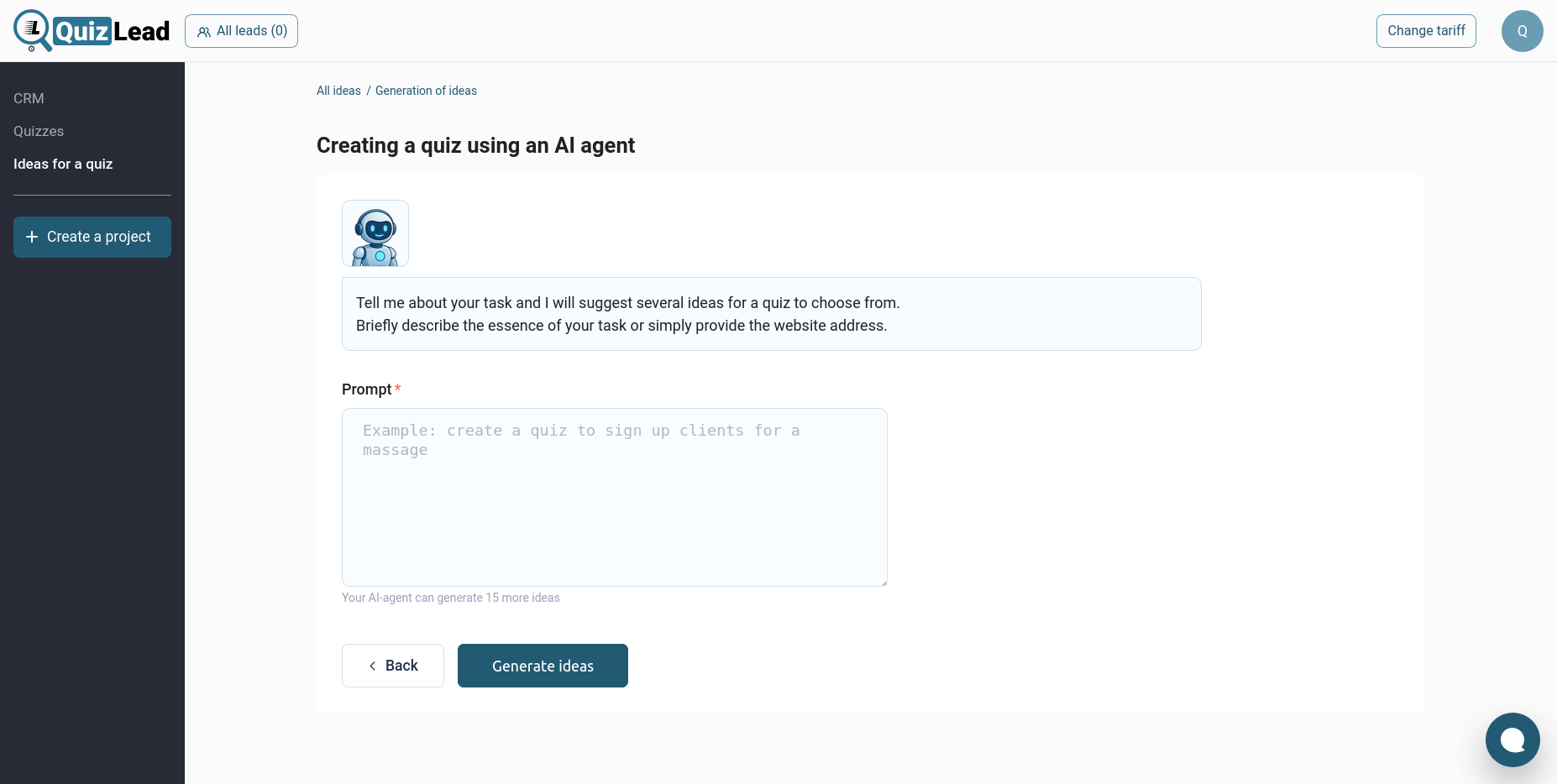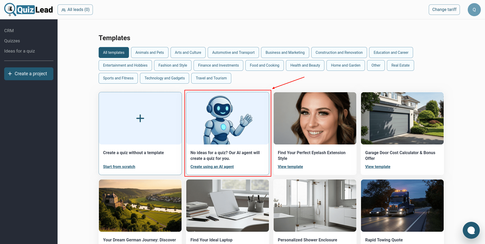 Inicie sesión en QuizLead y haga clic en el botón "Crear quiz". A continuación, seleccione la opción "Crear con Agente de IA":