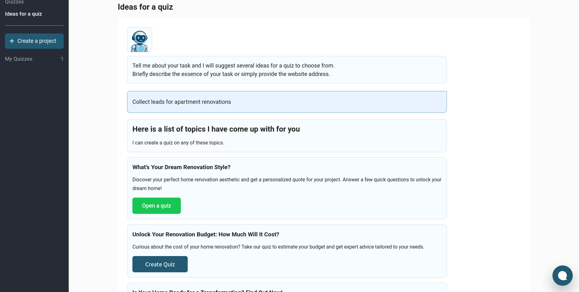 Haga clic en el botón "Crear quiz". Mientras mira la pantalla, nuestro agente de IA rellena todos los campos: crea la lógica, escribe el texto, configura las transiciones, idea las pistas y los bonos para el resultado. En unos segundos, un quiz completamente listo se abre en el editor ante usted.