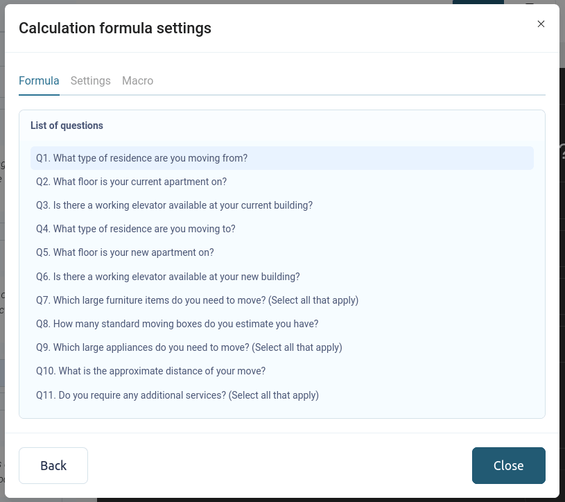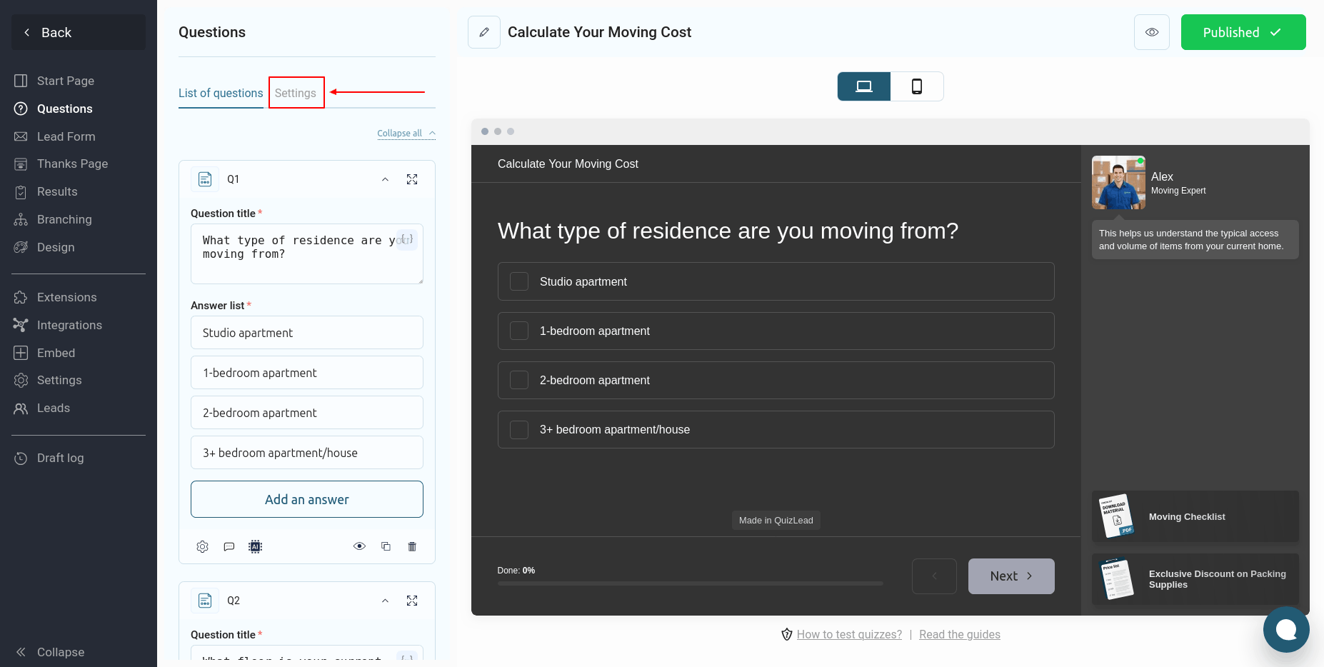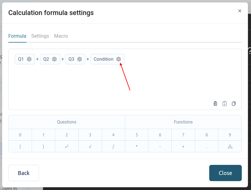 Para configurar una calculadora en un cuestionario, vaya a la sección "Preguntas" del cuestionario y cambie a la pestaña "Configuración":
