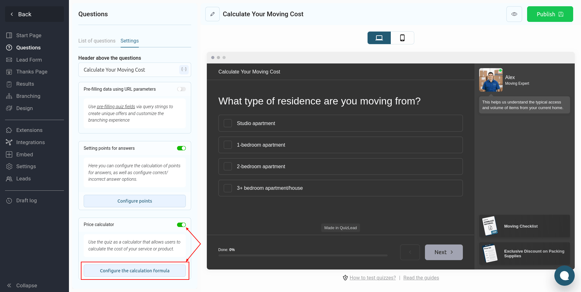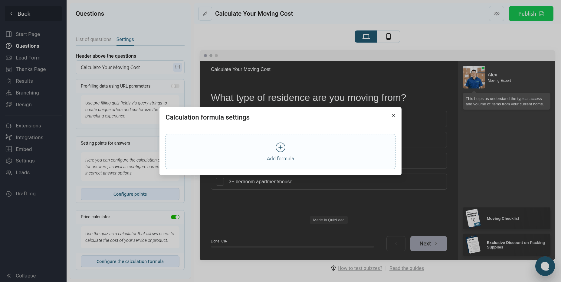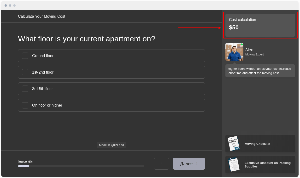 Con QuizLead, puedes crear fácilmente una calculadora en línea completamente funcional para calcular el coste de un producto o servicio. Nuestro editor te permite crear incluso las fórmulas de cálculo más complejas sin necesidad de programador.
