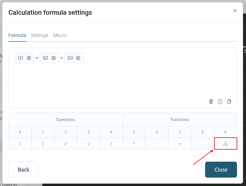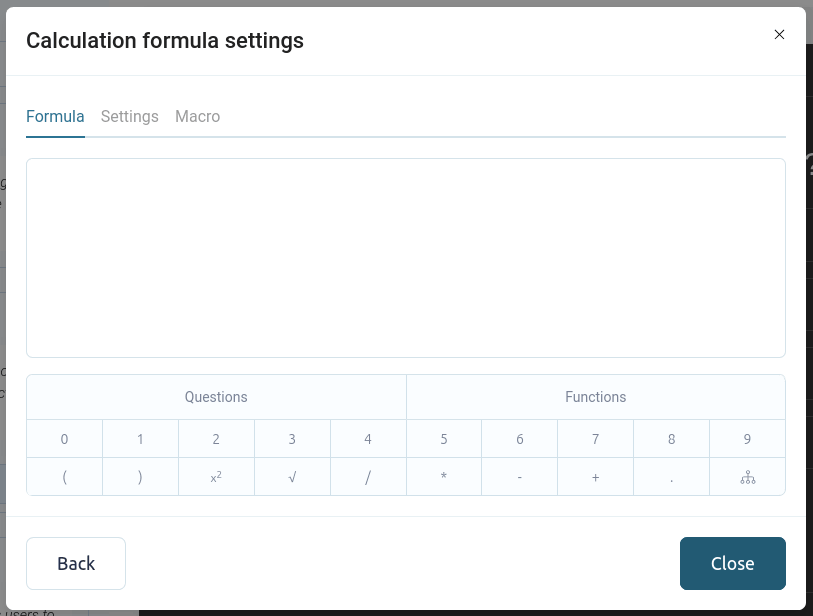En la sección "Fórmula", puedes configurar la fórmula matemática del chat. Puedes usar operaciones matemáticas básicas. Para agregar valores a las preguntas del cuestionario, haz clic en el botón "Preguntas".