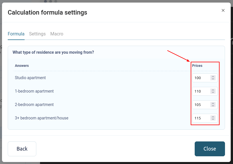 Para volver a la configuración de la fórmula, haga clic en el botón "Atrás".