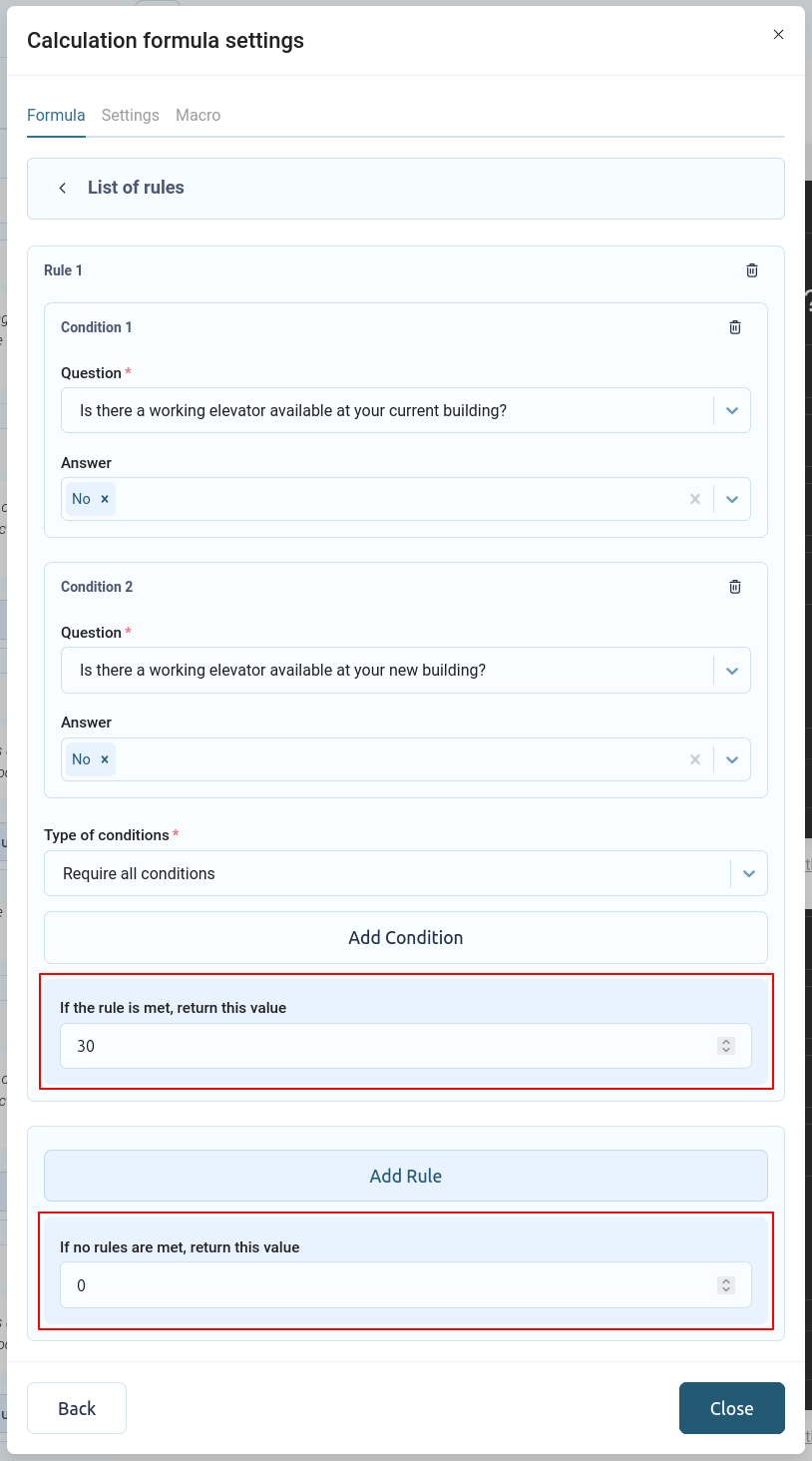 En este bloque, puede agregar varias reglas. Cada regla puede tener varias condiciones. Si se cumplen todas las condiciones de una regla, se considera válida y su valor se devuelve a la fórmula.