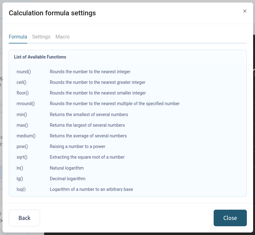 Se abrirá una ventana frente a usted donde podrá administrar las fórmulas de cálculo: