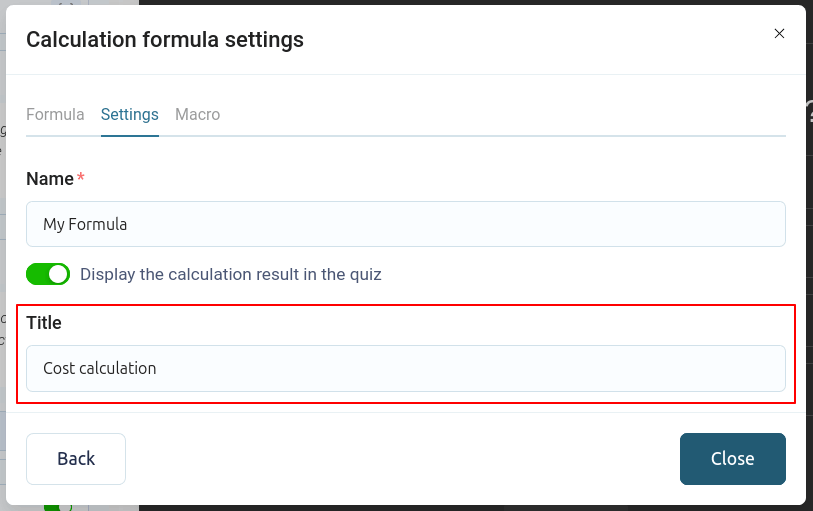 Active la opción "Mostrar el resultado del cálculo en el cuestionario" e ingrese el título que se mostrará en el cuestionario: