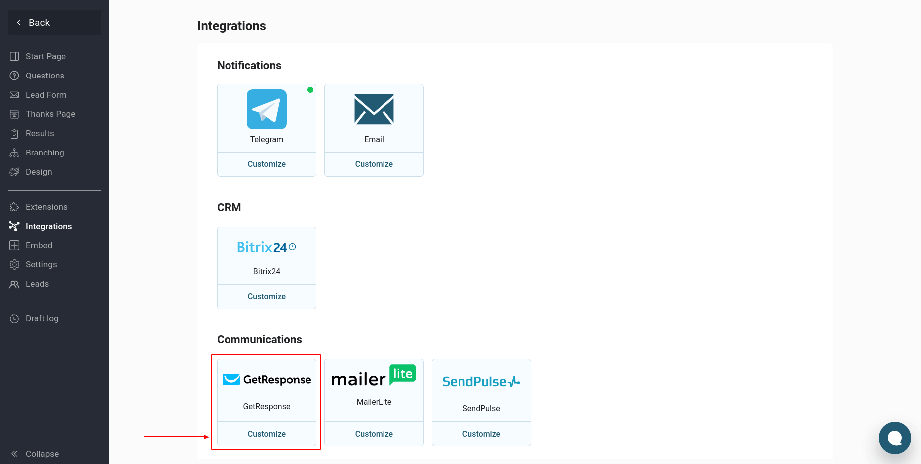 To set up a quiz integration with GetResponse, go to the "Integrations" section of the desired quiz and edit it. Find the "GetResponse" module in the list of integrations and click the "Customize" button: