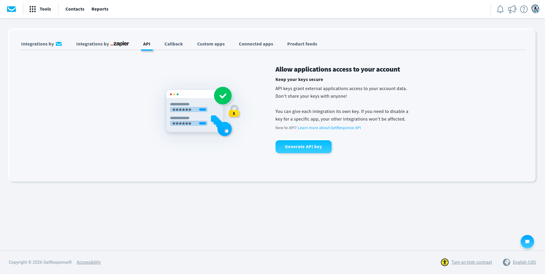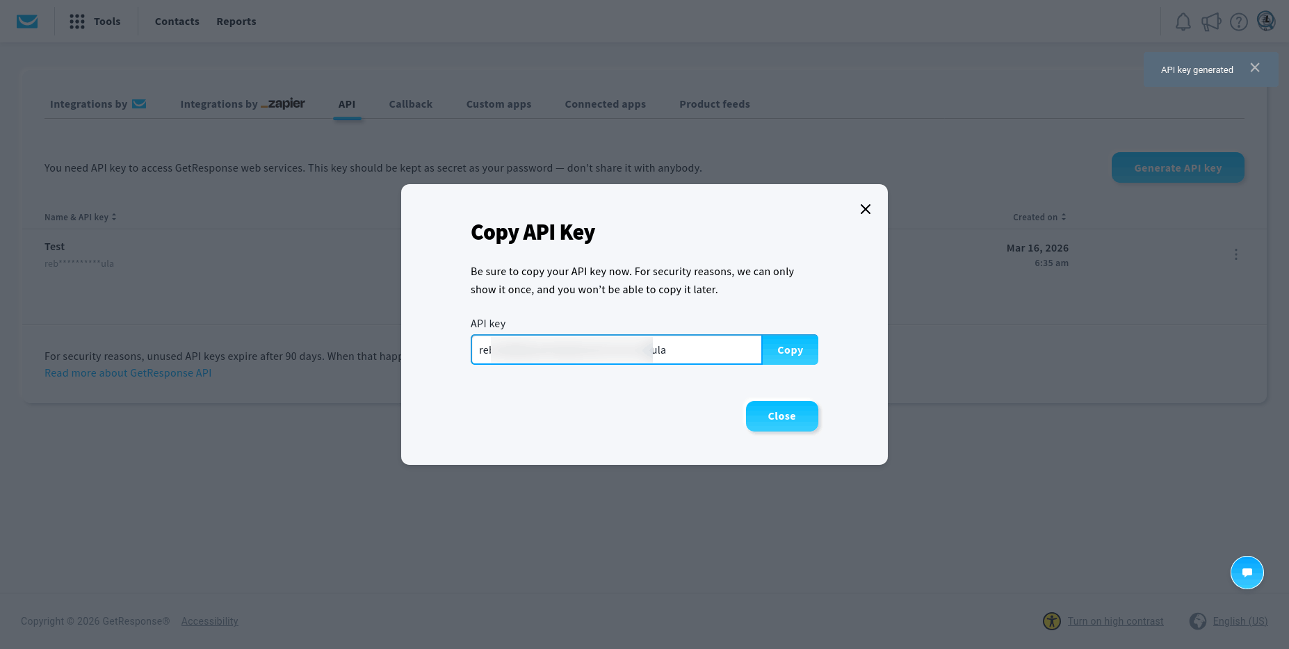 Copy the value of the generated API key and enter it in the GetResponse integration settings and click the "Connect" button: