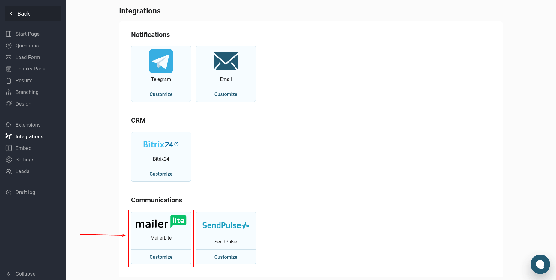 To configure a quiz integration with MailerLite, go to the "Integrations" section of the desired quiz and edit it. Find the "MailerLite" module in the list of integrations and click the "Customize" button: