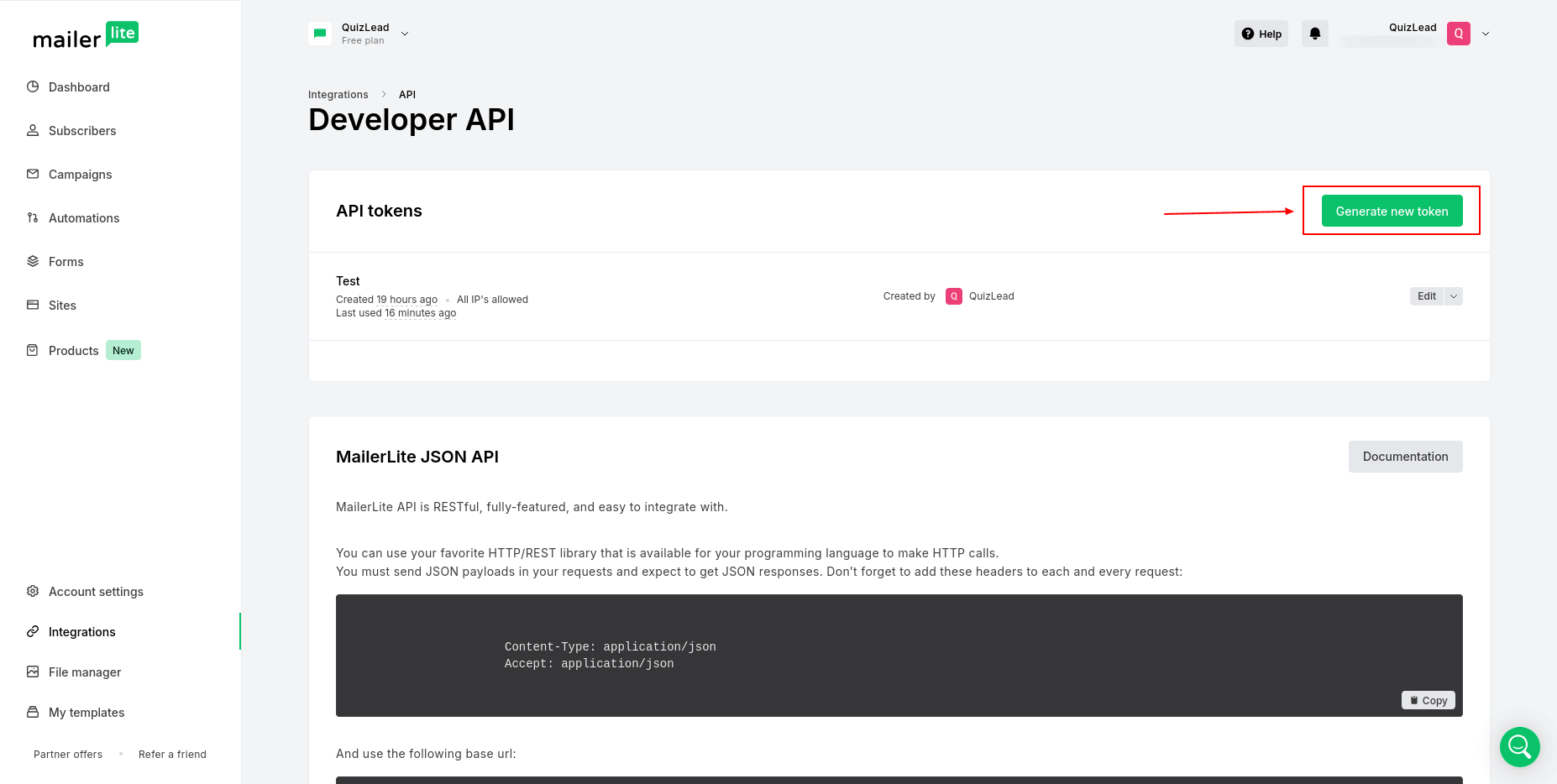 Here you need to enter your API token. You can find these values in your MailerLite account under "Integrations" -> "API":