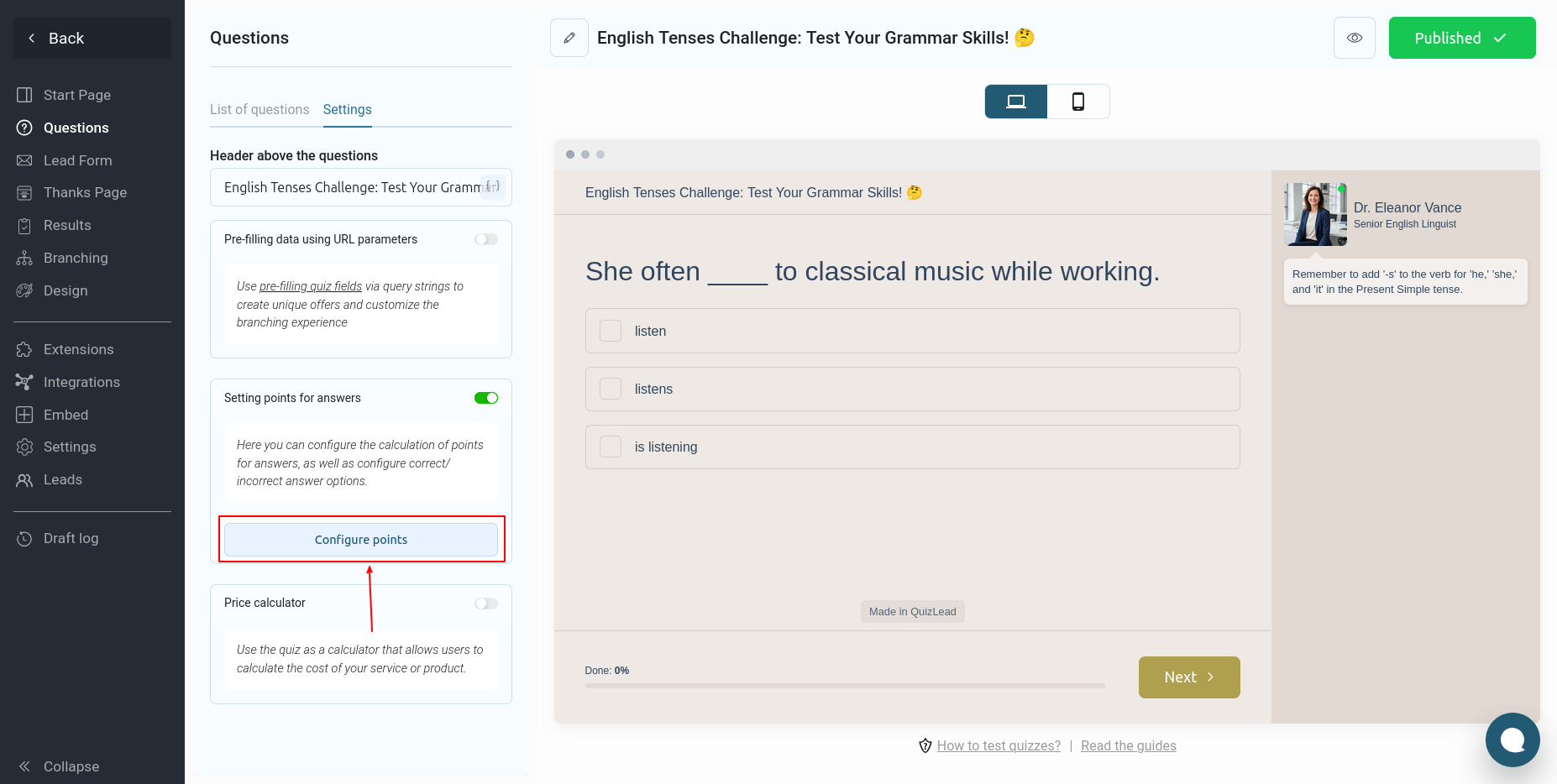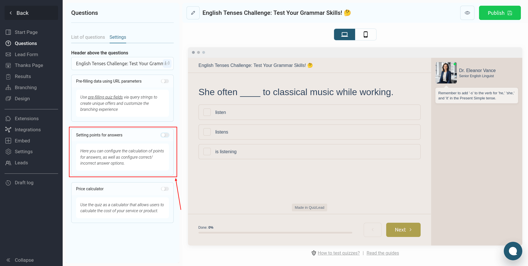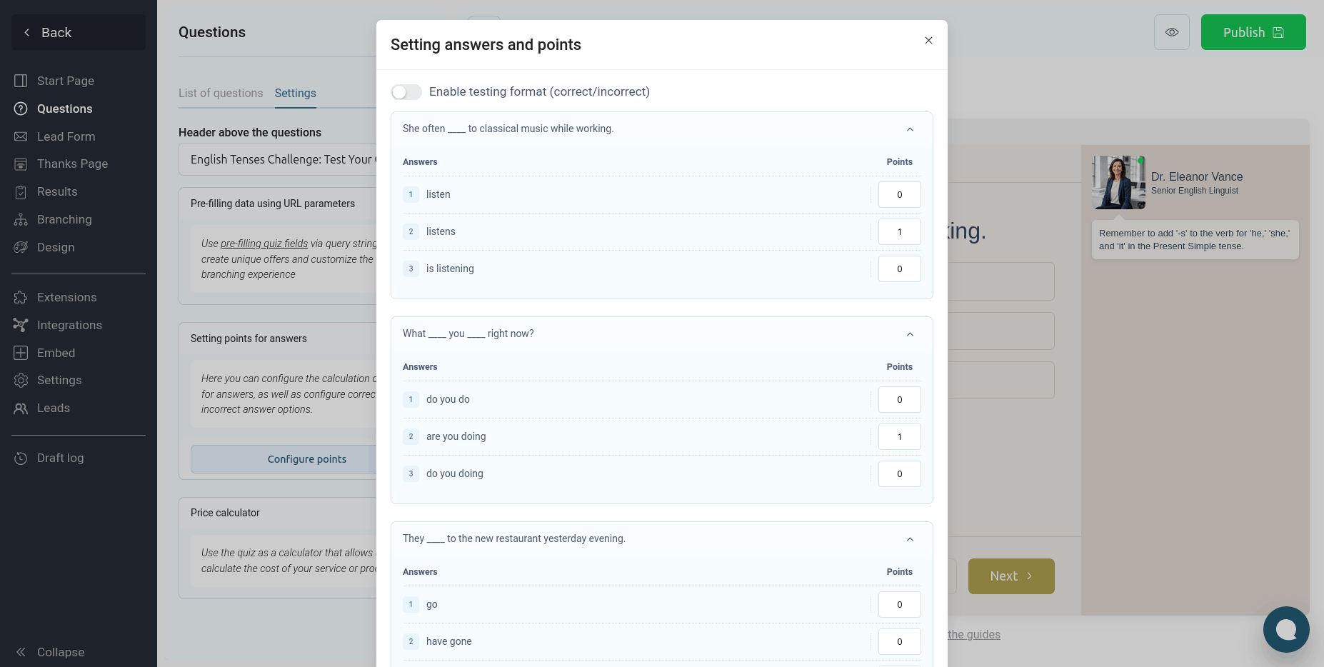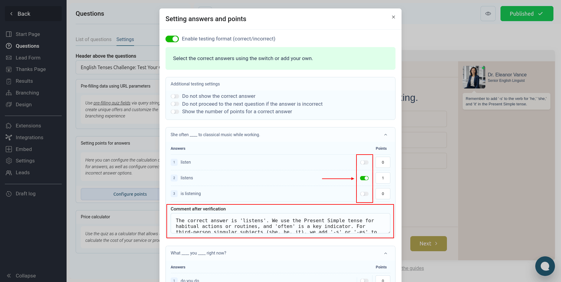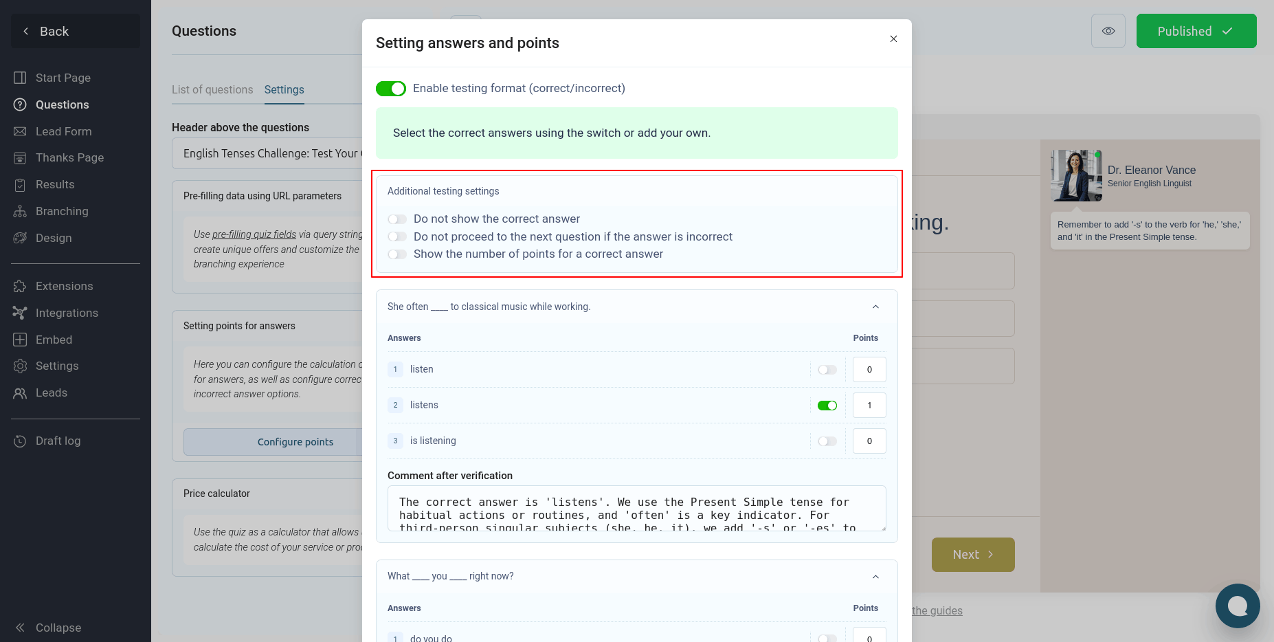 Здесь вы можете настроить баллы для правильных ответов и квиз будет автоматически подсчитывать их сумму. Но если же вам необходимо отображать правильный и неправильный ответ пользователю, и выводить комментарий по каждому вопросу, то вам необходимо активировать переключатель "Включить формат тестирования":