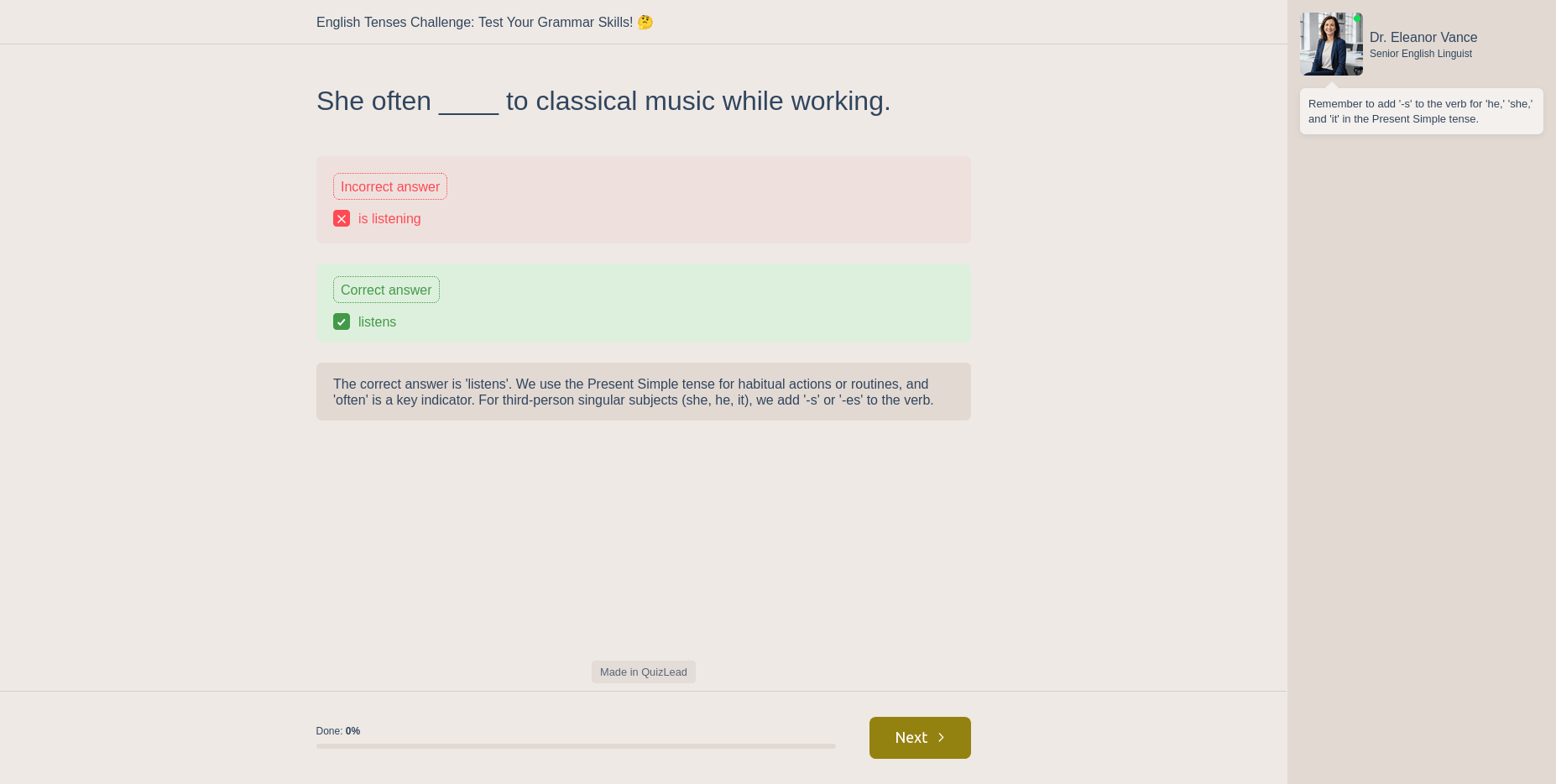 Готово! Теперь ваш квиз работает в формате тестирования "Правильно/Неправильно".