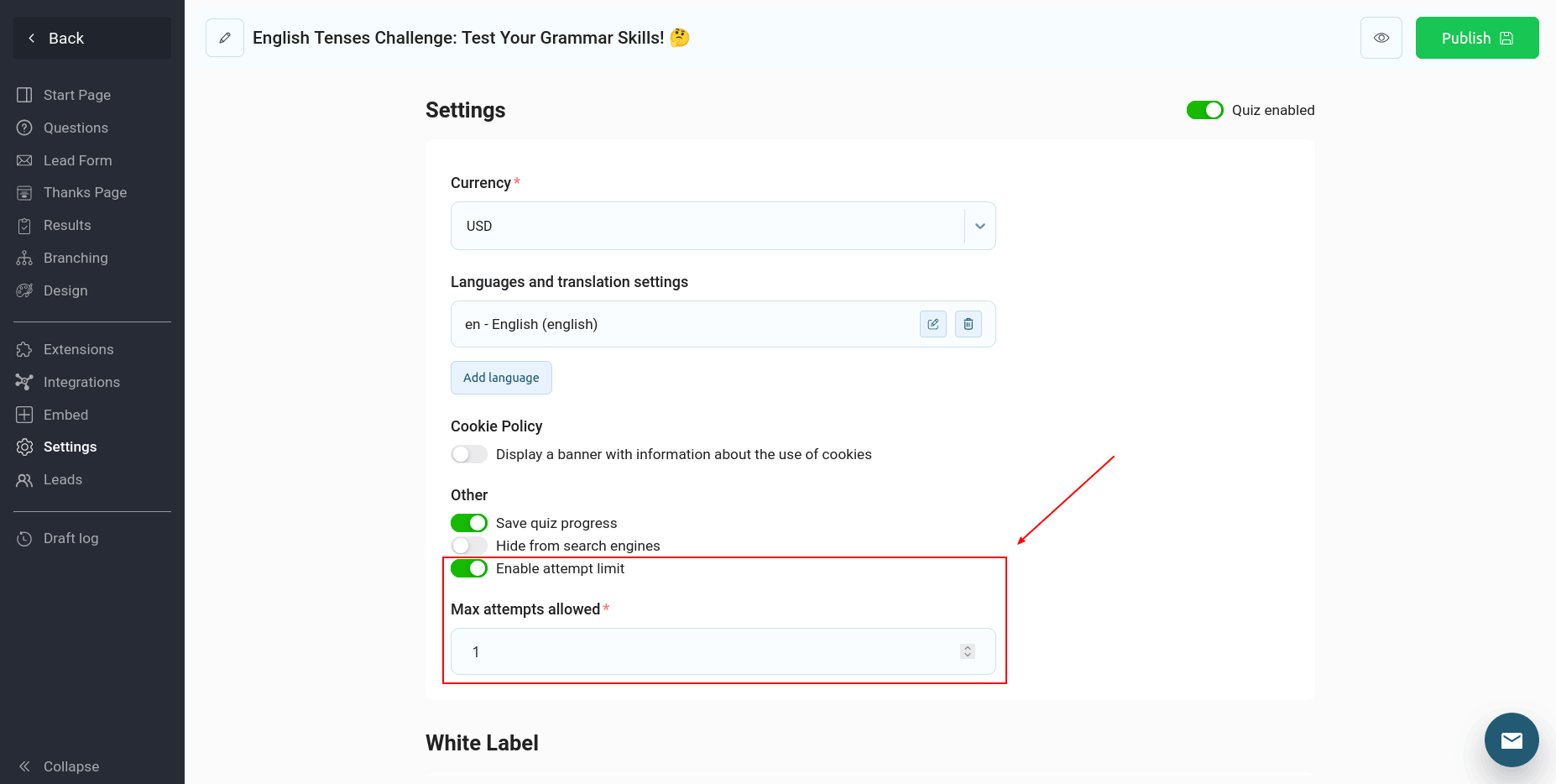 Чтобы сохранить прогресс прохождения теста и защитить его от манипуляций, вы можете включить соответствующий переключатель в настройках квиза: